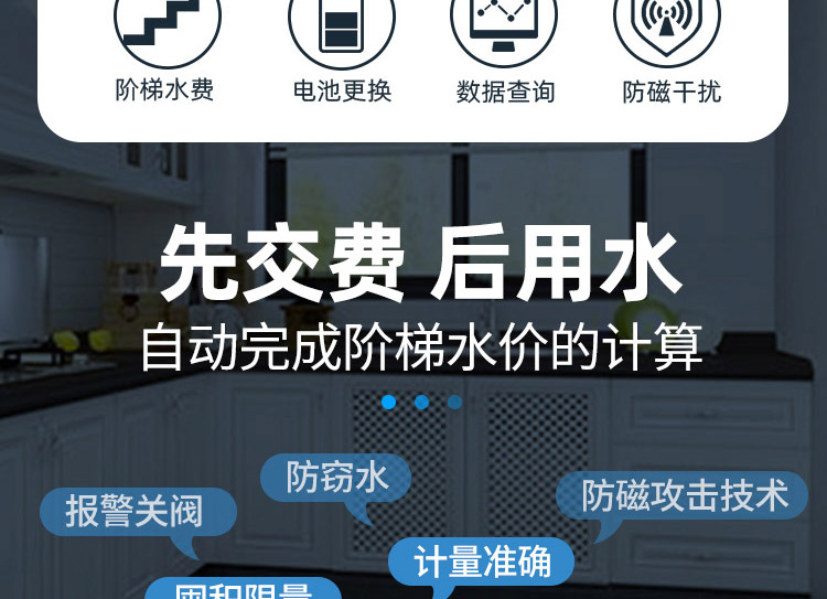 3、可對用水量進行記錄和電子顯示,還可以按照約定對用水量自動進行控制,自動完成階梯水價的計算。